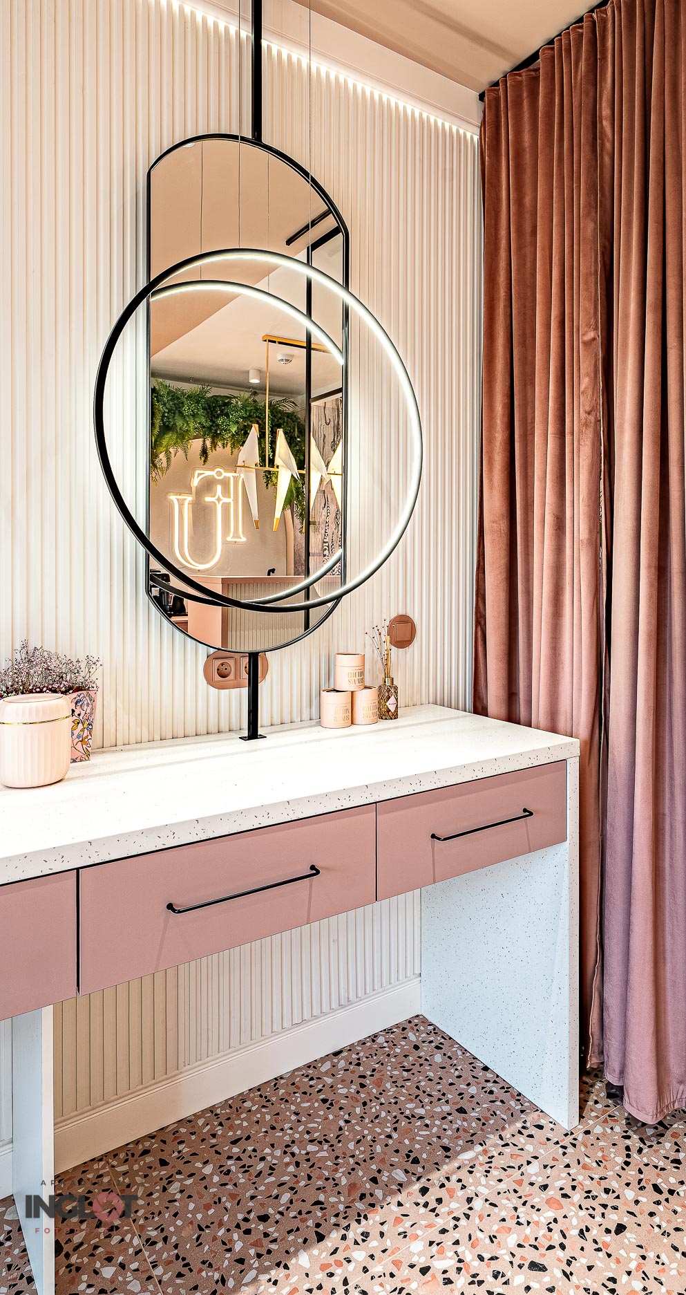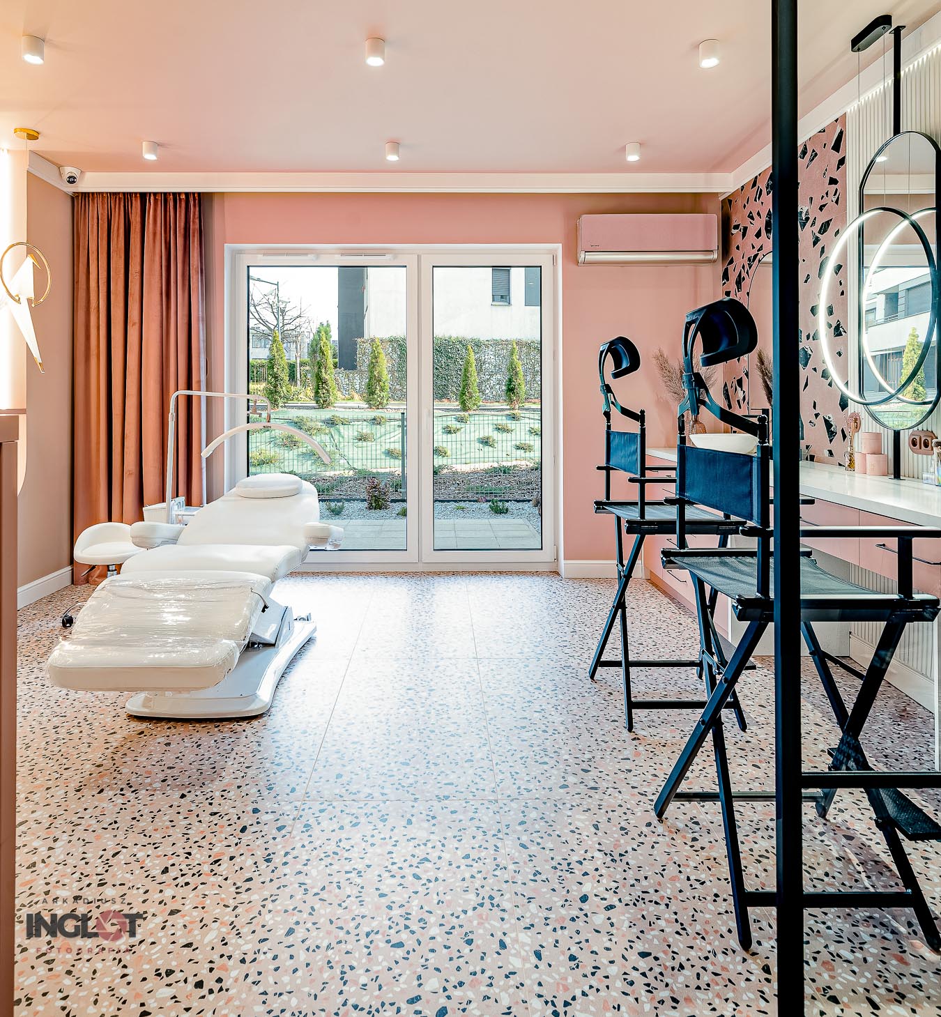 Wnętrze salonu zostało w pełni zaprojektowane przez NOA Studio - Anna Nowacka z dbałością o każdy detal – designerskie, ale jednocześnie schludne, przyjazne i funkcjonalne. Pudrowy róż w połączeniu z jasnymi akcentami i prostą formą tworzy przestrzeń, która emanuje spokojem i estetyką – idealne tło dla usług beauty.